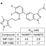 Aquí vemos la estructura de las nuevas moléculas diseñadas para bloquear la N-miristoiltransferasa humana. La versión más potente, la 1088, tiene un segundo átomo de flúor en la posición marcada con la X. Los números muestran qué concentración de la sustancia es necesaria para que la mitad de las N-miristoiltransferasas (NMT, tanto tipo 1 como tipo 2) sean inhibidas.