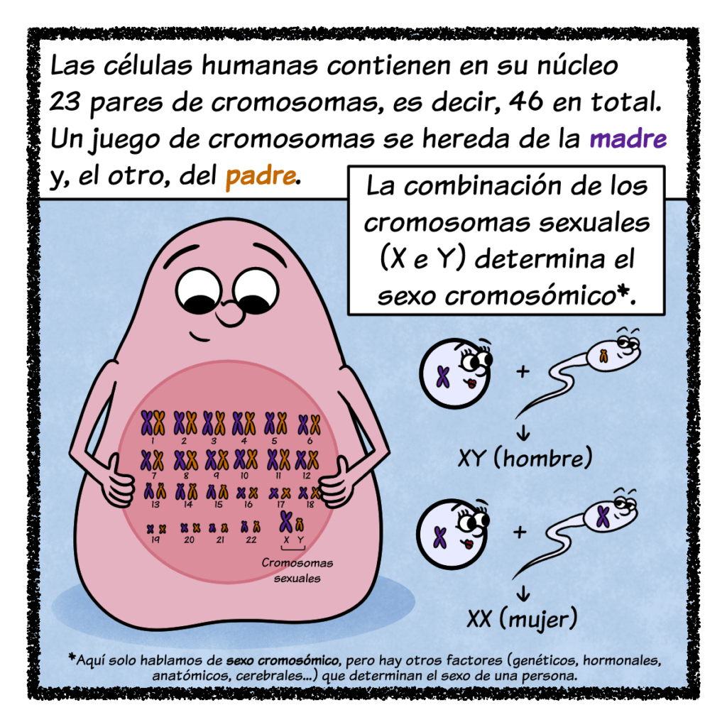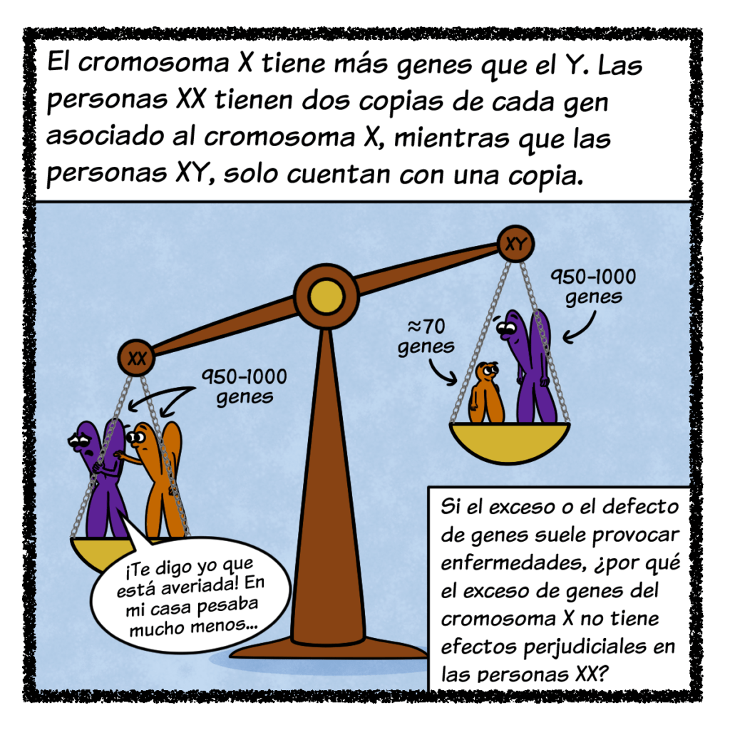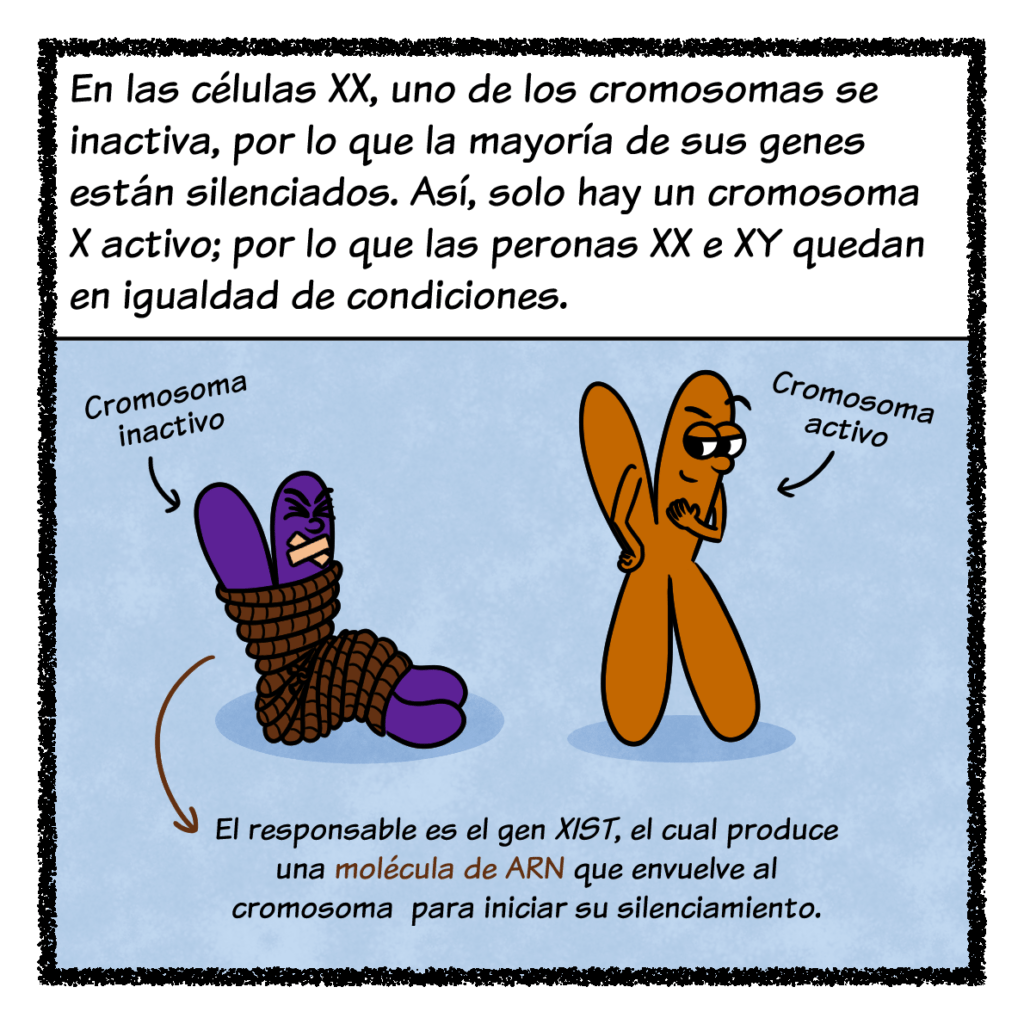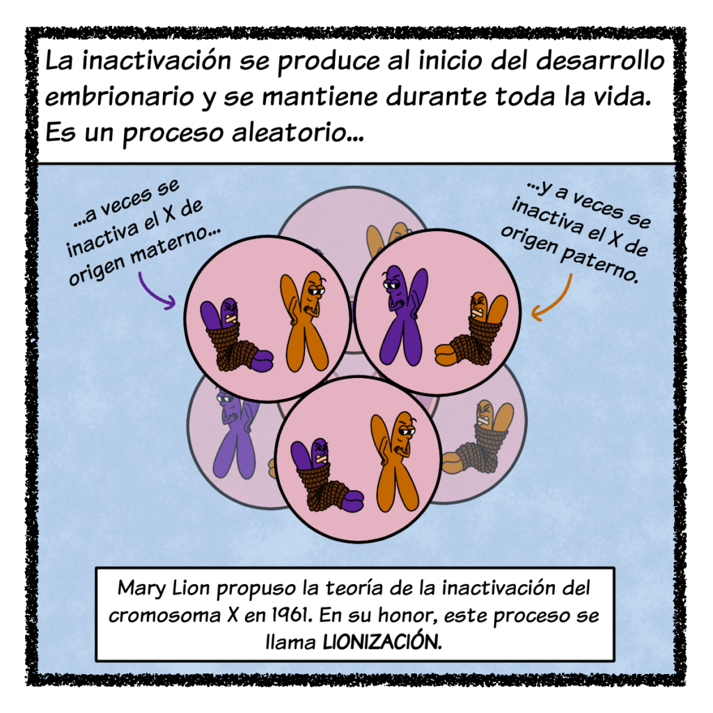 Empecemos por la lionización. De los 23 pares de cromosomas que tienen las células 🧬, hay dos un tanto especiales: los cromosomas sexuales X e Y. Aunque las células del cuerpo tienen dos de estos cromosomas, el óvulo y el espermatozoide solo llevan uno cada uno. Cuando se funden en la fecundación, la combinación de cromosomas sexuales resultante determina el sexo cromosómico: mujer si es XX u hombre si es XY (¡ojo! Solo hablo de sexo cromosómico, ya que hay muchos más factores que determinan el sexo de una persona). El cromosoma Y es mucho más pequeño y contiene menos genes que el cromosoma X, por lo que las personas XX tienen en total más genes que las personas XY. Si el exceso o el defecto de información genética suele causar enfermedades, ¿cómo es posible que este desequilibrio no tenga consecuencias negativas? Al inicio del desarrollo embrionario, solo en las personas XX, uno de los dos cromosomas X se inactiva y casi todos sus genes se silencian. Es un mecanismo de compensación de la dosis génica: al apagar todos esos genes extra, las personas XX y XY quedan en igualdad de condiciones, con el mismo número de genes encendidos. Este mecanismo se llama lionización en honor a quien lo describió: Mary Lion.
