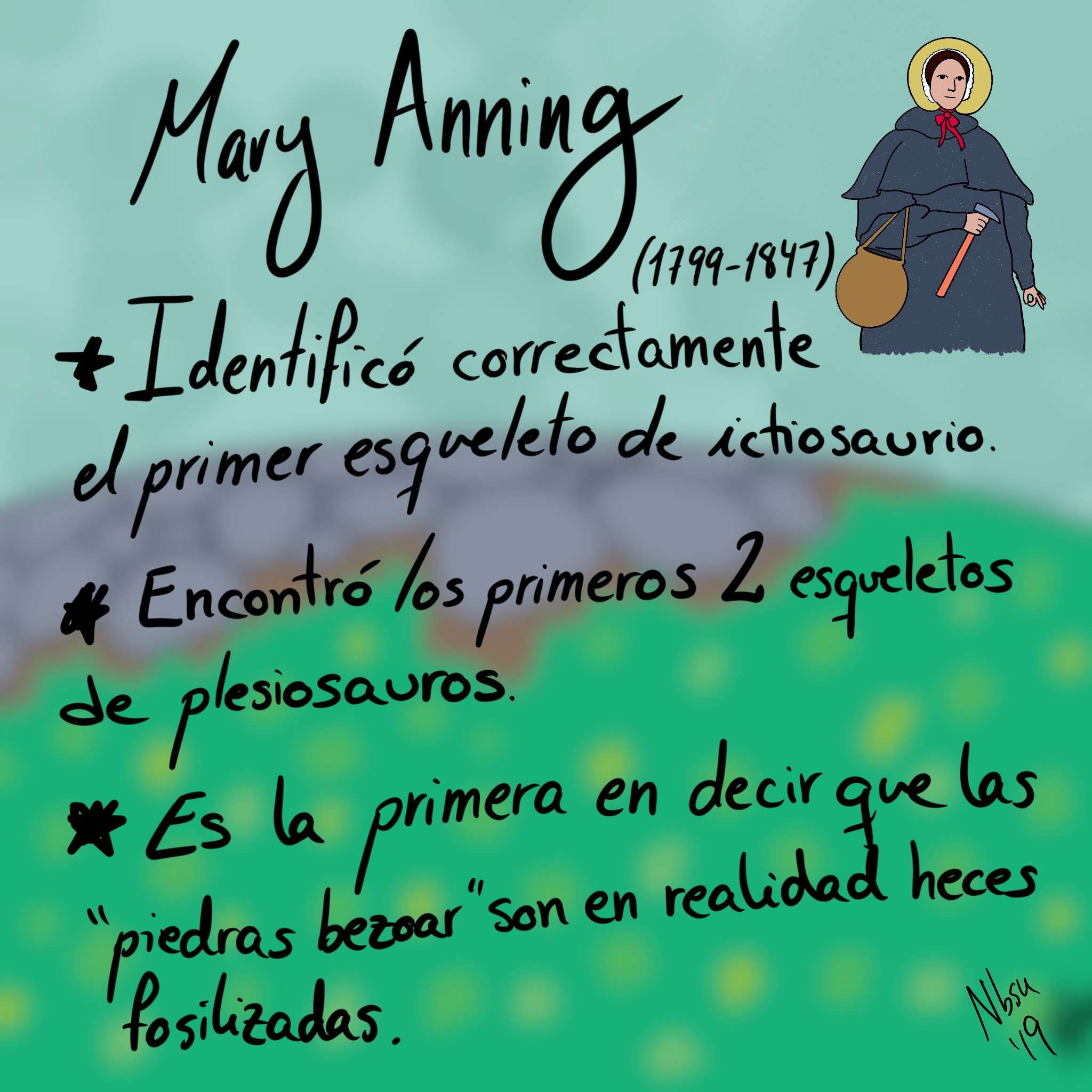Mary Anning (Lyme Regis, 21 de mayo de 1799 – 9 de marzo de 1847) fue la primera mujer reconocida como paleontóloga. Sería genial conocerla en el universo Animal Crossing, ya que en este videojuego se puede excavar en busca de fósiles de todo tipo, incluso los antiguamente conocidos como «piedras bezoar».