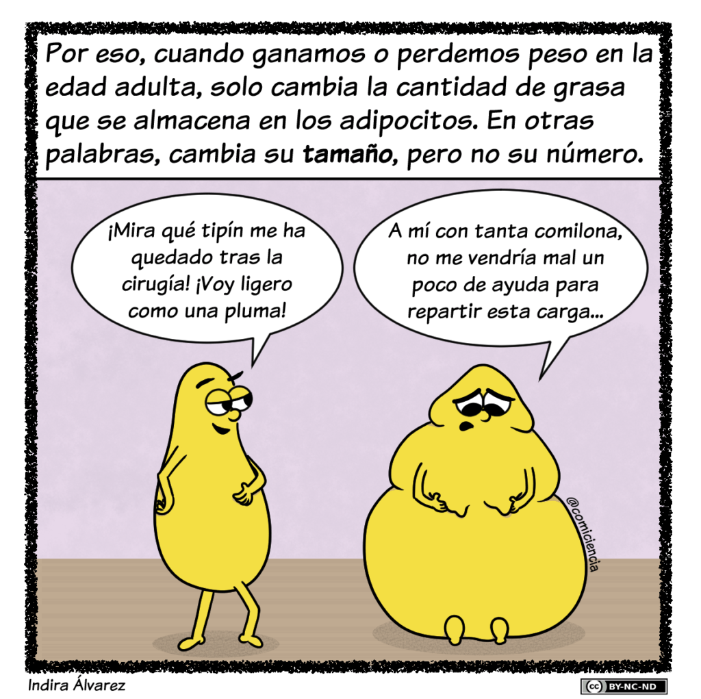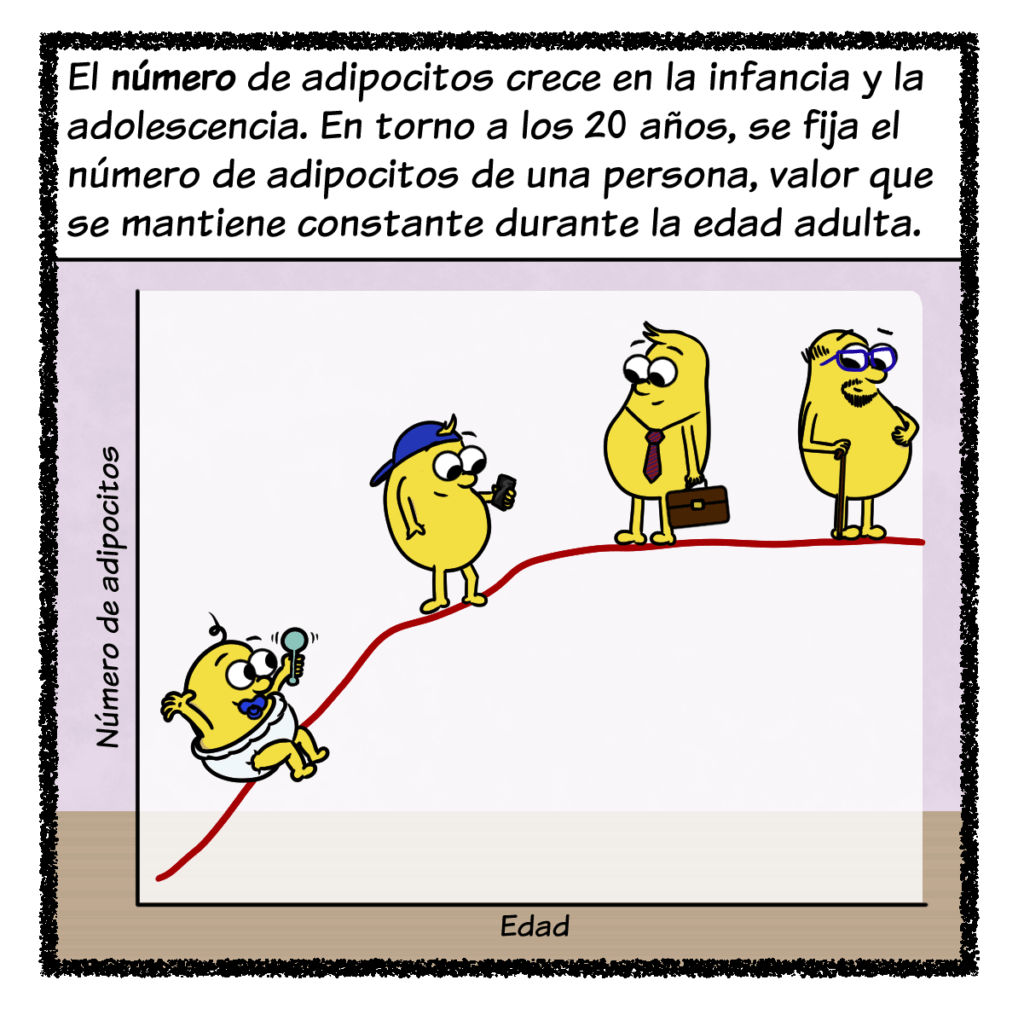 El número de adipocitos crece durante la infancia y la adolescencia, pero a partir de los 20 años se fija un valor que ya se mantiene constante durante toda la edad adulta, independientemente de que se modifique el peso corporal. Por eso, cuando ganamos o perdemos masa grasa en la edad adulta, lo que cambia es la cantidad de grasa que se almacena en los adipocitos. Es decir, cambia su tamaño, pero no su número.